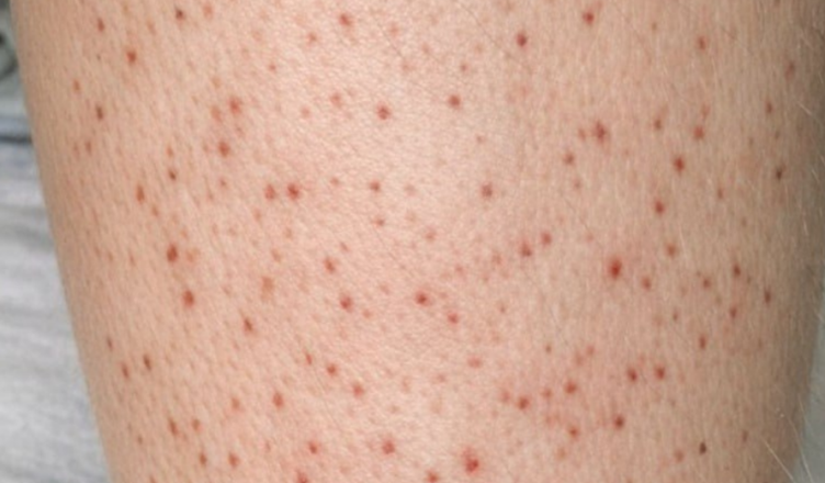 Tyto tečky mohou být petechie – drobné červené nebo fialové skvrny způsobené prasknutím malých cév pod kůží. Mohou být způsobeny mírným tlakem nebo onemocněními postihujícími cévy nebo krevní destičky.