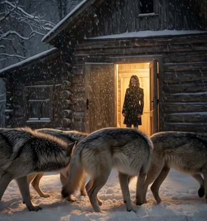 Jedné mrazivé noci, během prudké sněhové bouře, uviděla oknem čtyři vlky, jak nehybně stojí před dveřmi.