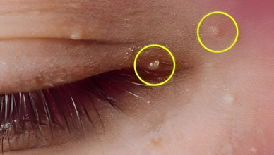 Na obličeji se mohou objevit malé, tvrdé, bílé pupínky, které připomínají pupínky nebo bradavice. Ty se nazývají milia a vznikají v důsledku usazování